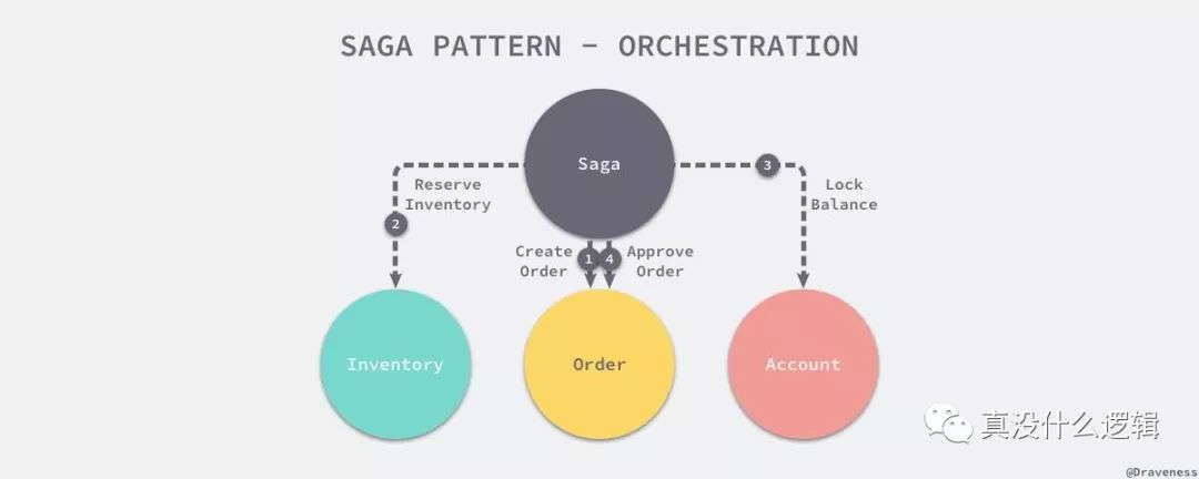 在这里我们就引入了一个中心化的『协调器』,它会保存当前分布式事务进行到底的状态,并根据情况对事务进行回滚或者提交操作,在服务编排的过程中,我们是从协调者本身触发考虑整个事务的执行过程的,相对于协同的方式,编排实现的过程相对来说更为简单。