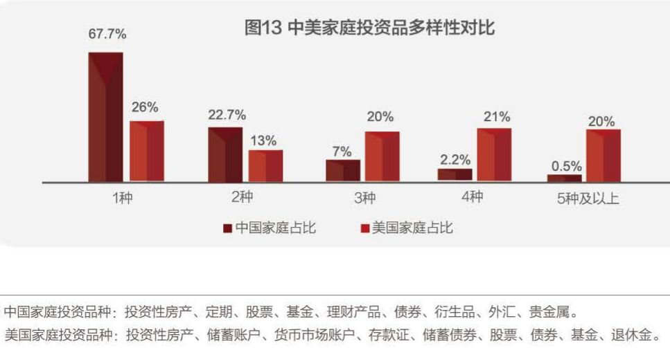 有67.7%的中国城市家庭仅拥有一种投资品,拥有2种的为22.7%,拥有3种以上的仅10.6%,而美国拥有3种及以上投资品的家庭占比达到了61%。
