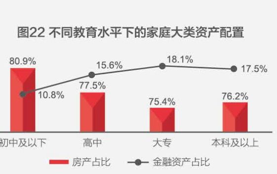 家庭的房产占比基本随着户主受教育水平的提高而降低,学历为初中及以下的家庭,房产占比高达80.9%;高于本科及以上的学历家庭76.2%的占比。