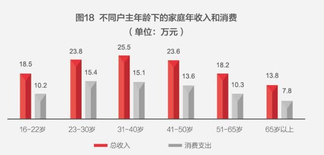 《报告》还显示,中国城市家庭收入与年龄呈“倒U形”分布。户主年龄在31-40岁时家庭平均年收入最高,达到25.5万元,其次为23-30岁的家庭,平均年收入23.8万元。