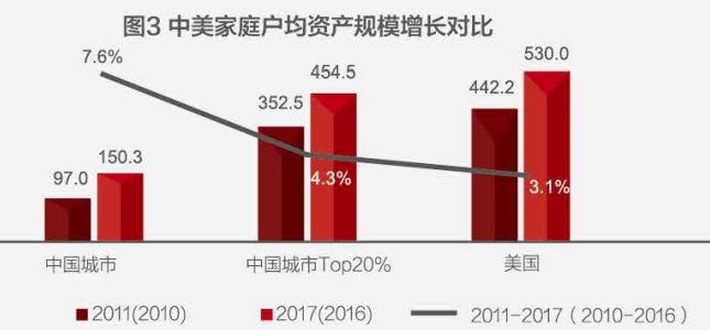 我国城市家庭资产规模快速增长——家庭户均资产规模从2011年的97.0万元增加到2017年的150.3万元,年均复合增长率为7.6%。