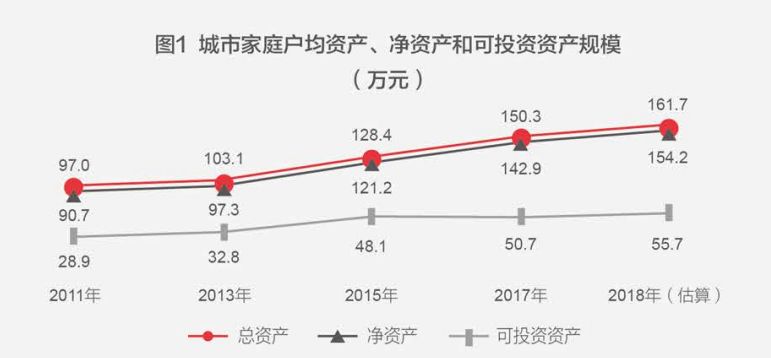 2018年,我国城市家庭的户均总资产规模为161.7万元,户均净资产规模为154.2万元,户均可投资资产规模为55.7万元。中国家庭财富逐年增加,财富总值已位列世界第二位。