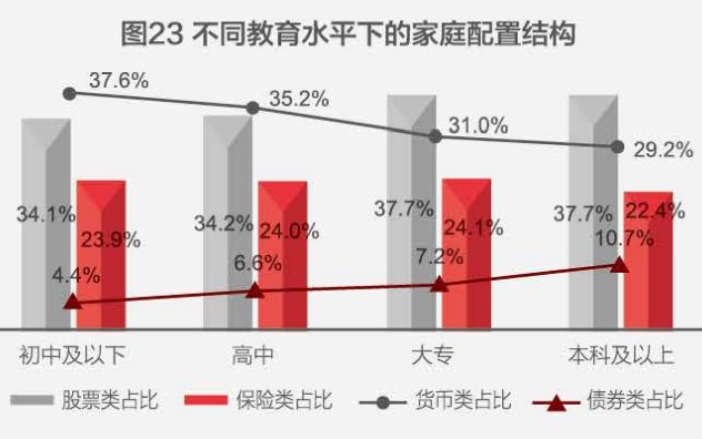 低学历水平的家庭,货币类产品配置明显高于其它学历水平的家庭,而债券和股票的占比则明显低于其它学历水平的家庭。