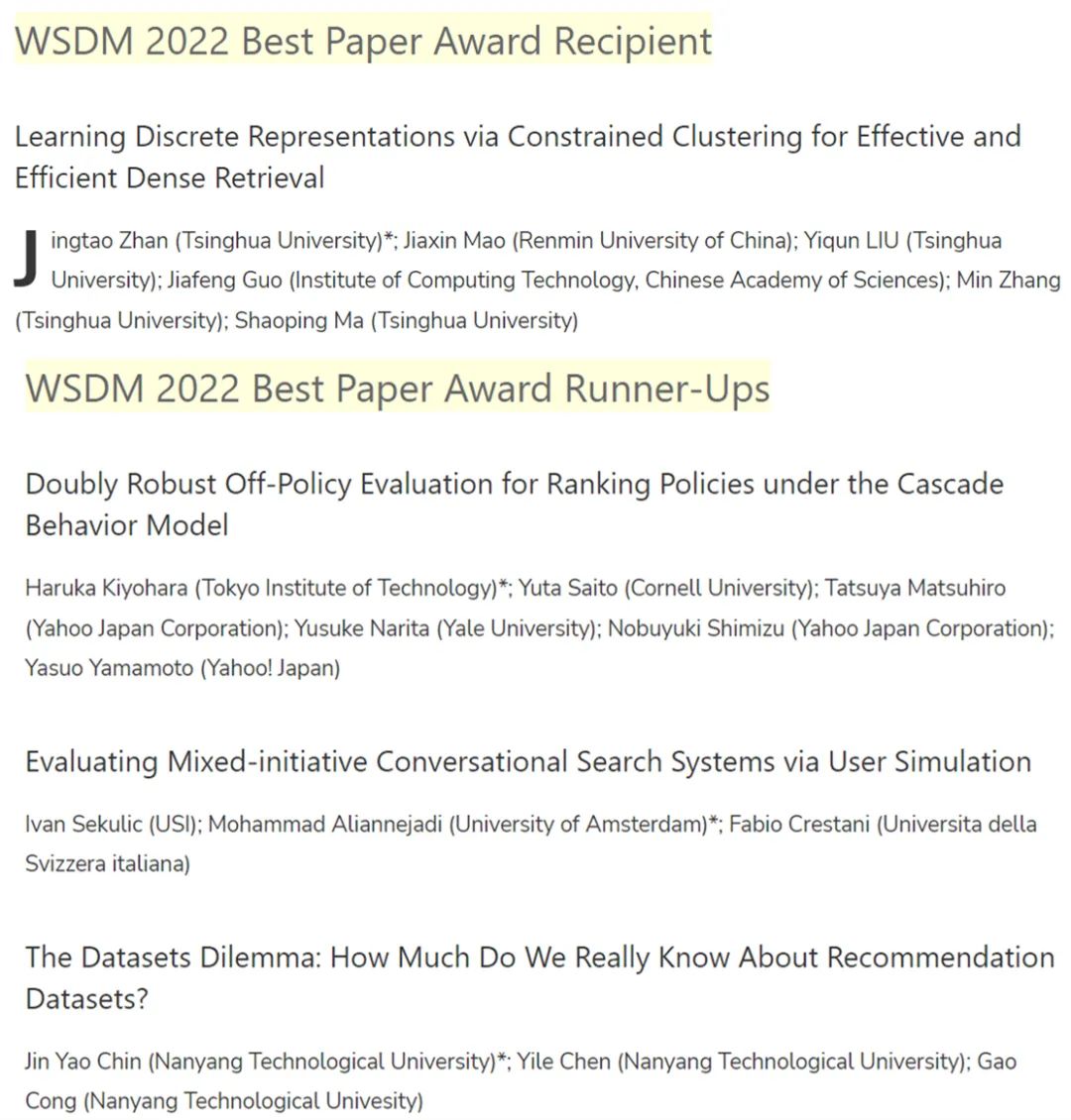 在第 15 届 ACM 国际互联网搜索与数据挖掘大会(WSDM 2022)上,来自清华、人大和中科院计算所的研究者获得了最佳论文奖,时间检验奖花落推荐系统。