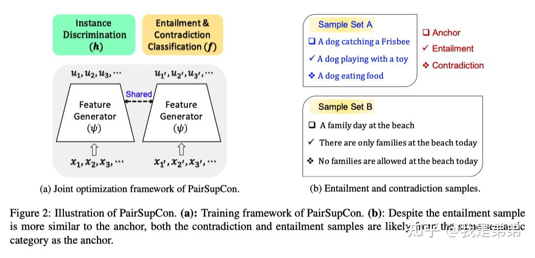 表示一个蕴含或者矛盾句子对。因此,它的正例(positive)是 NLI 数据集中的每个句子对中的 entailment 句子对。实例对比的目标函数是使得输入的正对