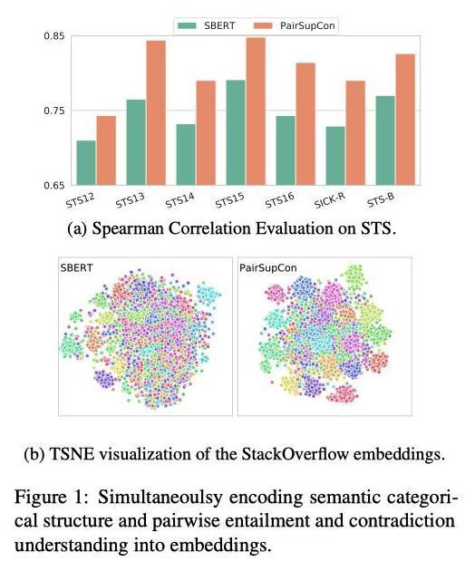 因此,PairSupCon 利用了这种隐式分组效应,将来自同一语义类别的表示集合在一起,同时增强了模型的语义蕴涵和矛盾推理能力。具体效果如 Fig1 所示,(a) 体现了 PairSupCon 增强了模型的语义蕴涵和矛盾推理能力。(b) 体现了模型高阶语义表示能力。