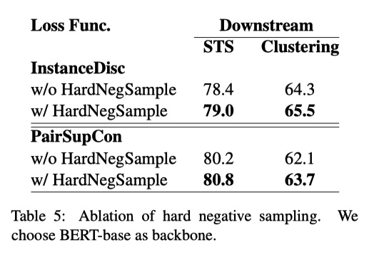 从实验结果可以看出,不管是单纯的实例鉴别还是 PairSupCon,加上困难样本后在 STS 和聚类任务上都有不同程度的性能提升。