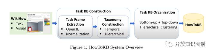 这篇文章提出了一个很有意思的问题:在搜索引擎中有大量用户在搜索问题解决型的信息,例如如何修自行车,但是作为搜索引擎中日益重要的知识库却缺乏这类问题解决型(How-to)的知识。WikiHow 是一个专注于解决“怎么做”问题的网站,作者基于 WikiHow 最终构建了一个专门包含问题解决型知识的知识库 HowToKB。HowToKB 的主要构建步骤有:1)通过 OpenIE 4.2 软件从 WikiHow 网站的文本中抽取三元组。2)组织 Task KB,主要包含两个任务,一个是WikiHow内容的去重和聚类,例如任务 paint a wall 和 color aceiling 有很大相似性。另一个是任务之间的消歧,例如任务 use a keyboard 可能是 use a music keyboard 也可能是 use acomputer keyboard。首先计算三种相似度:Categorical similarity、Lexical similarity 和 Vector similarity,将三种相似度当作特征生成最种两种任务(task)之间的相似度,然后采用层次聚类算法对任务进行聚类。HowToKB最终包含了去歧后的任务层次分类,每个任务的子任务顺序以及完成这个任务所需要的工具。在关于知识库构建和知识库组织方面的测评中,HowToKB 都有较高的准确率。作者最后还测试了一个 use case:自动搜索和 HowToKB 中的任务相关的 Youtube 视频。HowToKB 的构建过程如下图: