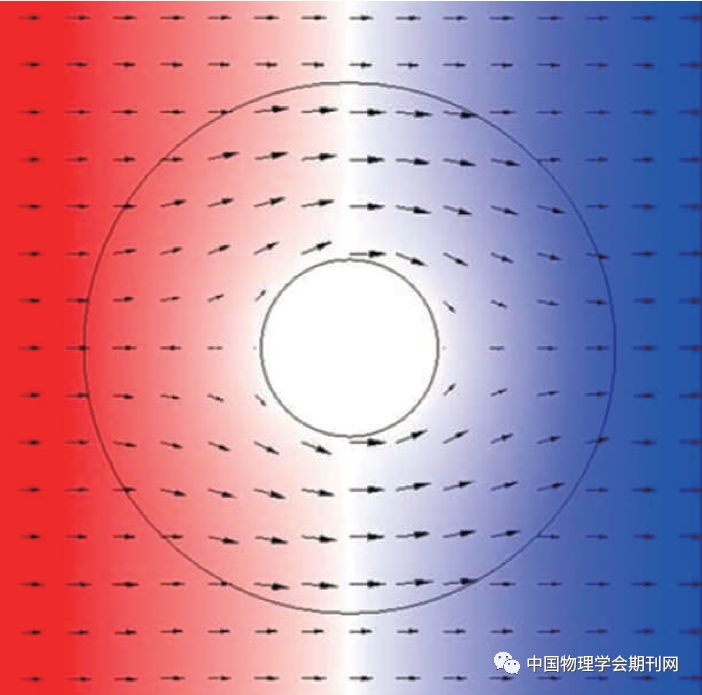 图1 热隐身斗篷温度分布的有限元模拟结果。此图呈现两个特点:(1)内圈里面温度均匀分布;(2)外圈之外的温度分布不受内外圈之间材料的影响。这两个特点直接导致,当内圈里存放一个不同物体,外圈外面的观察者将无法通过探测外圈外面的温度分布而推知内圈里物体的存在(图中左右边界分别与高温热源和低温热源相连,颜色代表温度分布;图中箭头表示热流的大小和方向)