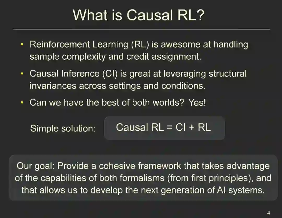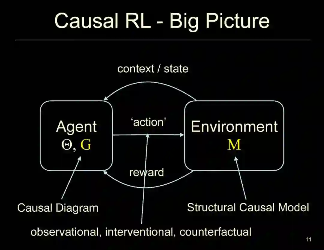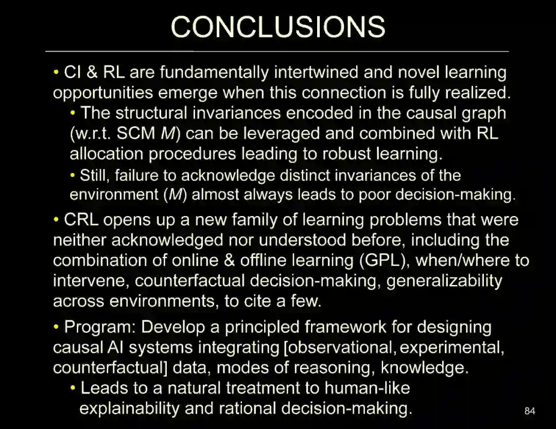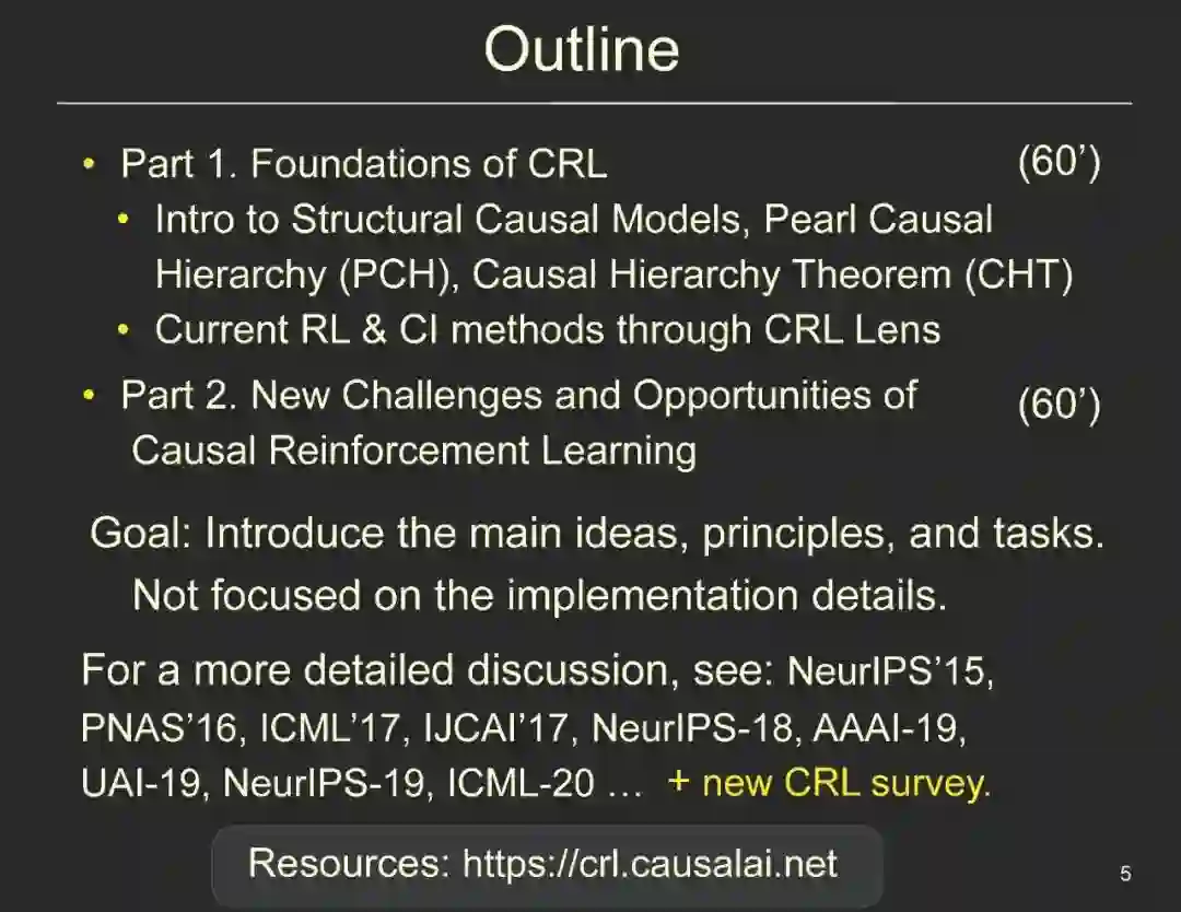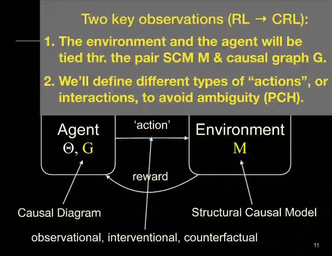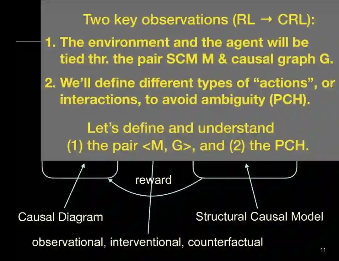 在本教程中,我们将基于这一观察结果引入统一的处理方法,并将这两个学科置于相同的概念和理论框架下。我们表明,当这一联系完全建立时,就会出现许多自然的和普遍的学习问题,而这不能单独从任何一个学科中看到。特别地,我们将讨论广义策略学习(在线、非策略和做微积分学习的组合)、何时何地干预、反事实决策(自由意志、自主、人与人工智能协作)、策略通用性和因果模仿学习等等。这种新的理解导致了对什么是反事实学习的更广泛的观点,并暗示了因果关系和强化学习并行研究的巨大潜力。我们称这种新的研究为“因果强化学习”(简称CRL)。