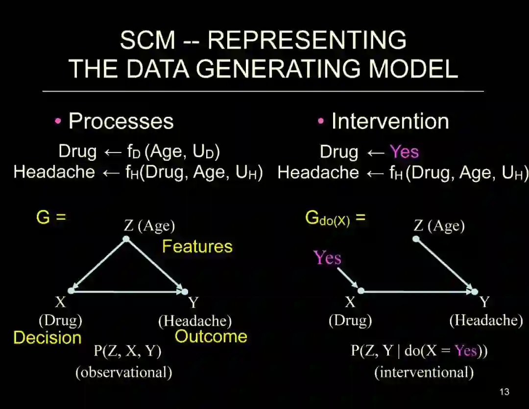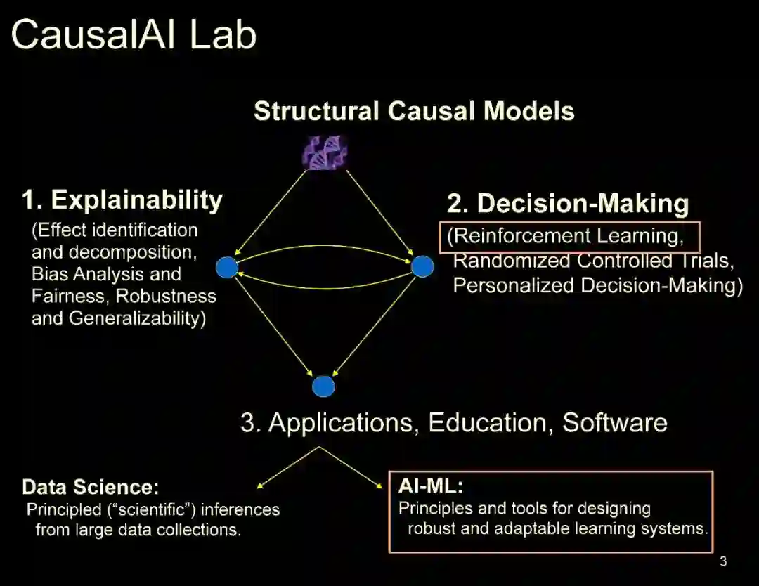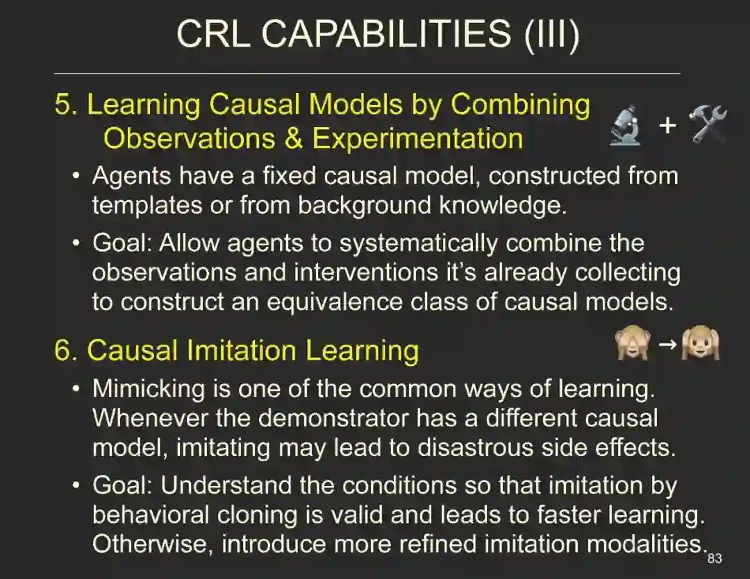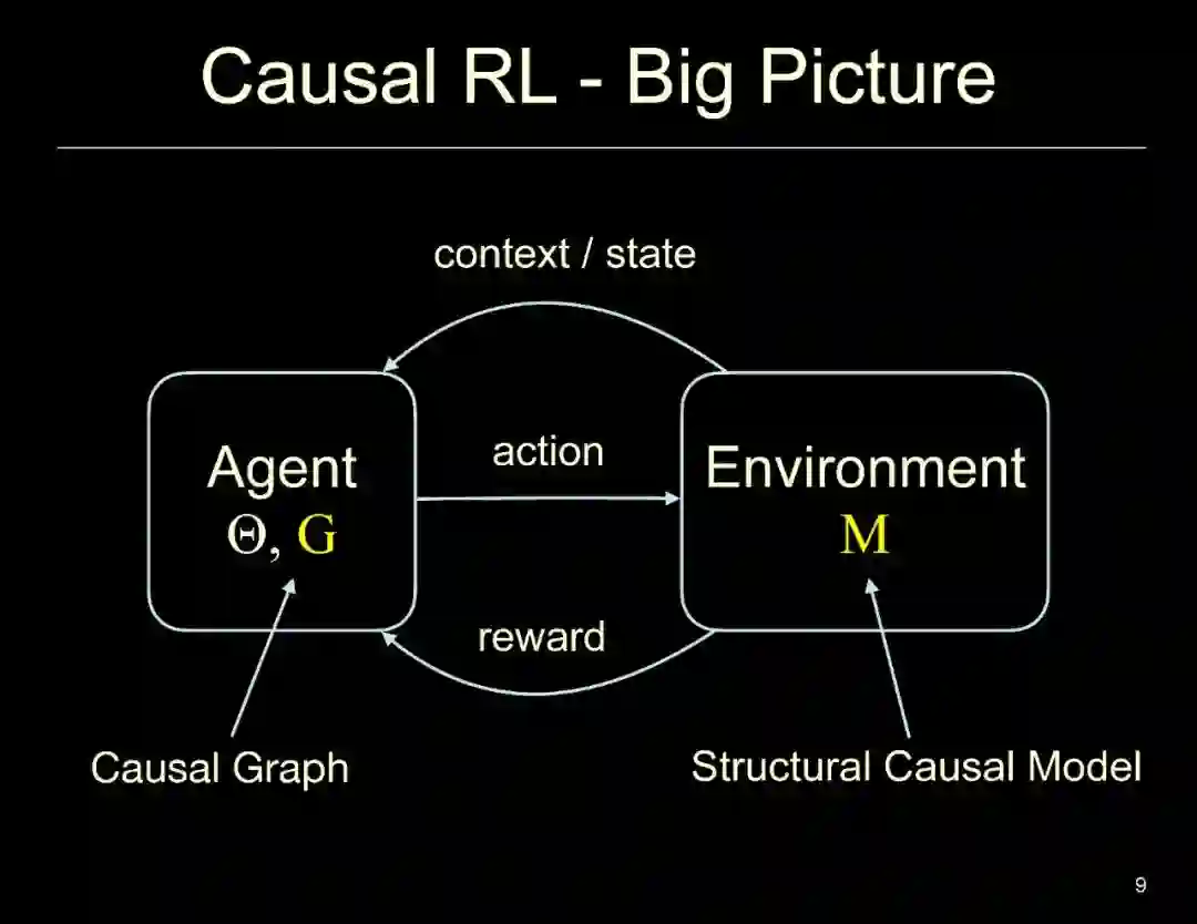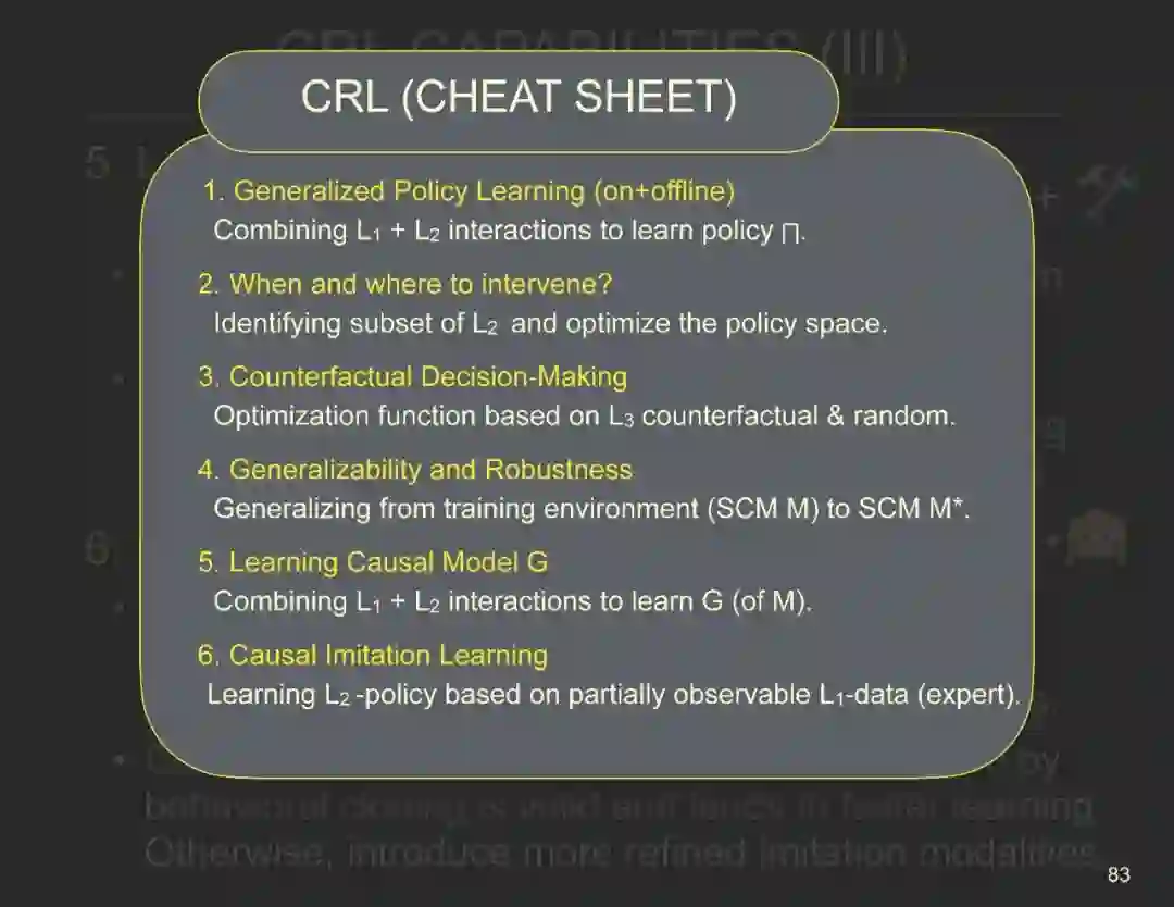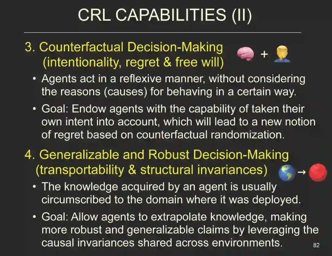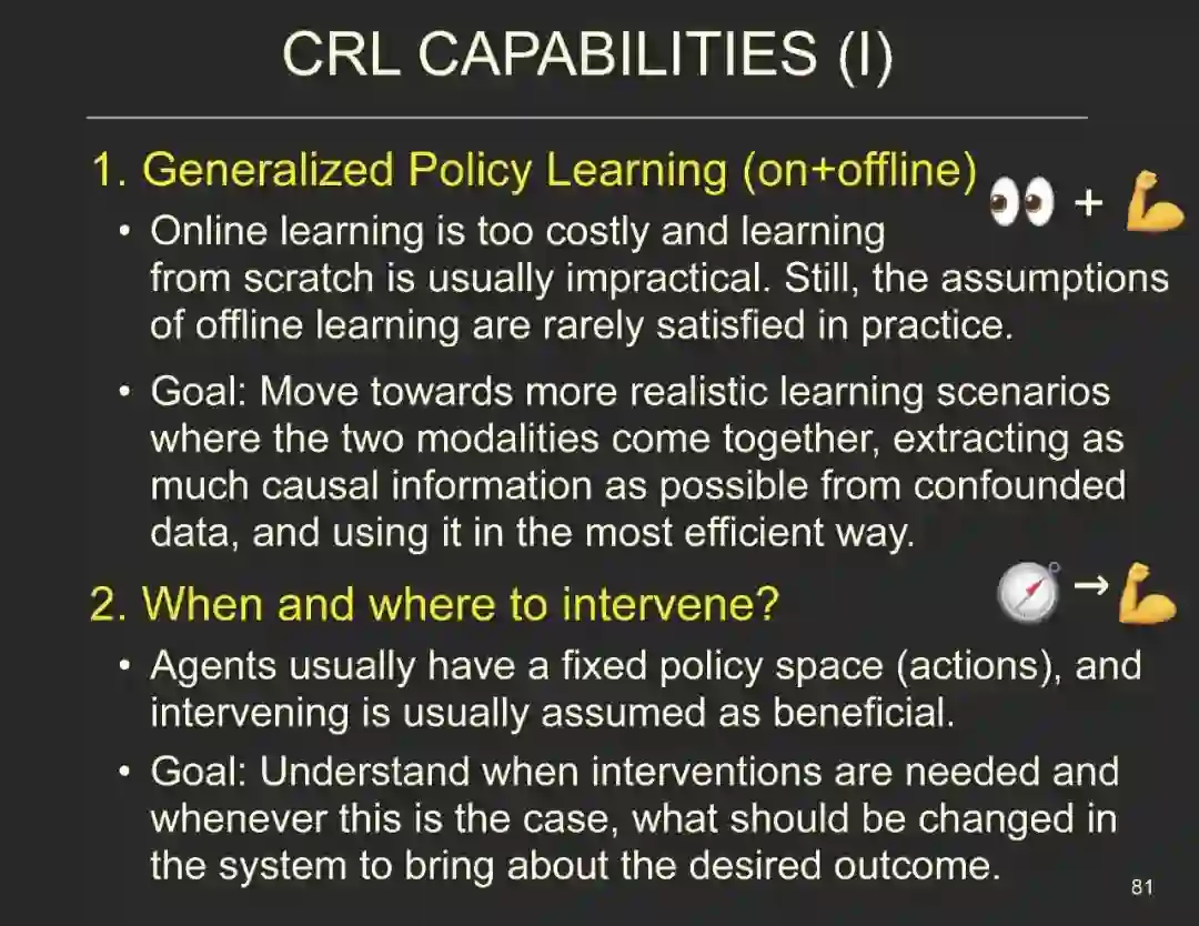 在本教程中,我们将基于这一观察结果引入统一的处理方法,并将这两个学科置于相同的概念和理论框架下。我们表明,当这一联系完全建立时,就会出现许多自然的和普遍的学习问题,而这不能单独从任何一个学科中看到。特别地,我们将讨论广义策略学习(在线、非策略和做微积分学习的组合)、何时何地干预、反事实决策(自由意志、自主、人与人工智能协作)、策略通用性和因果模仿学习等等。这种新的理解导致了对什么是反事实学习的更广泛的观点,并暗示了因果关系和强化学习并行研究的巨大潜力。我们称这种新的研究为“因果强化学习”(简称CRL)。