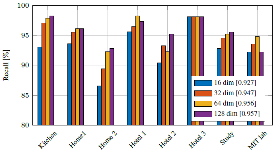 图5 召回率和3DSmoothNet输出维度间的关系,括号里的值表示所有场景的平均召回率.