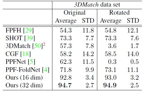 表1 3DMatch和3DRotatedMatch数据的结果。该表格展示了所有场景的平均召回率以及每种方法的标准偏差(STD),效果最好的用粗体显示。