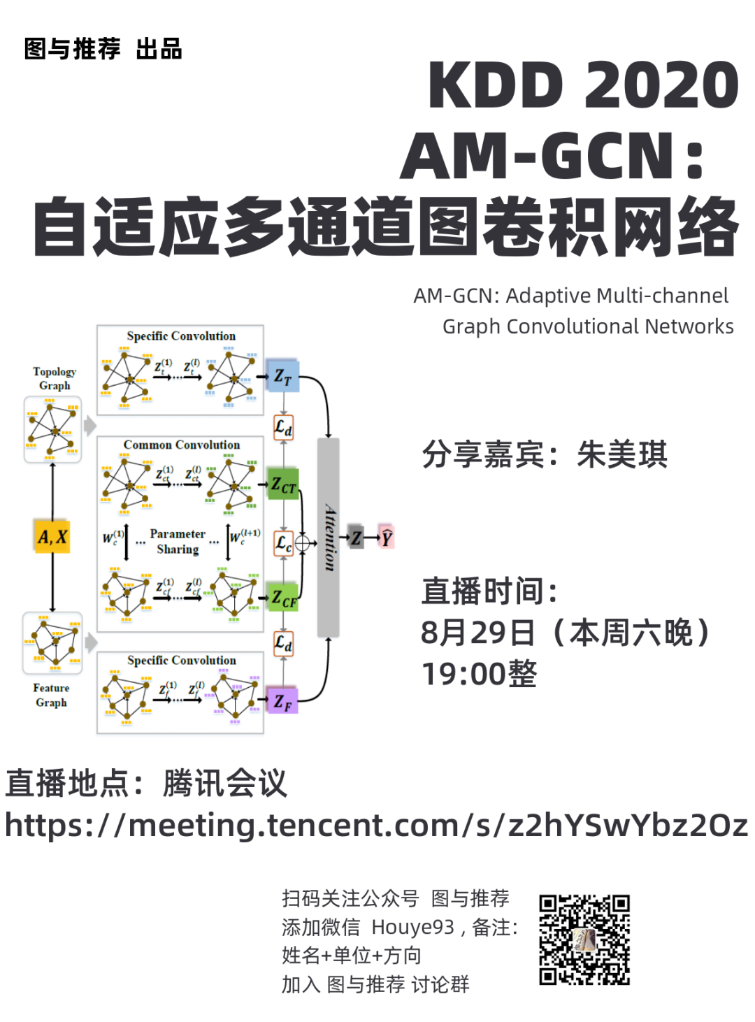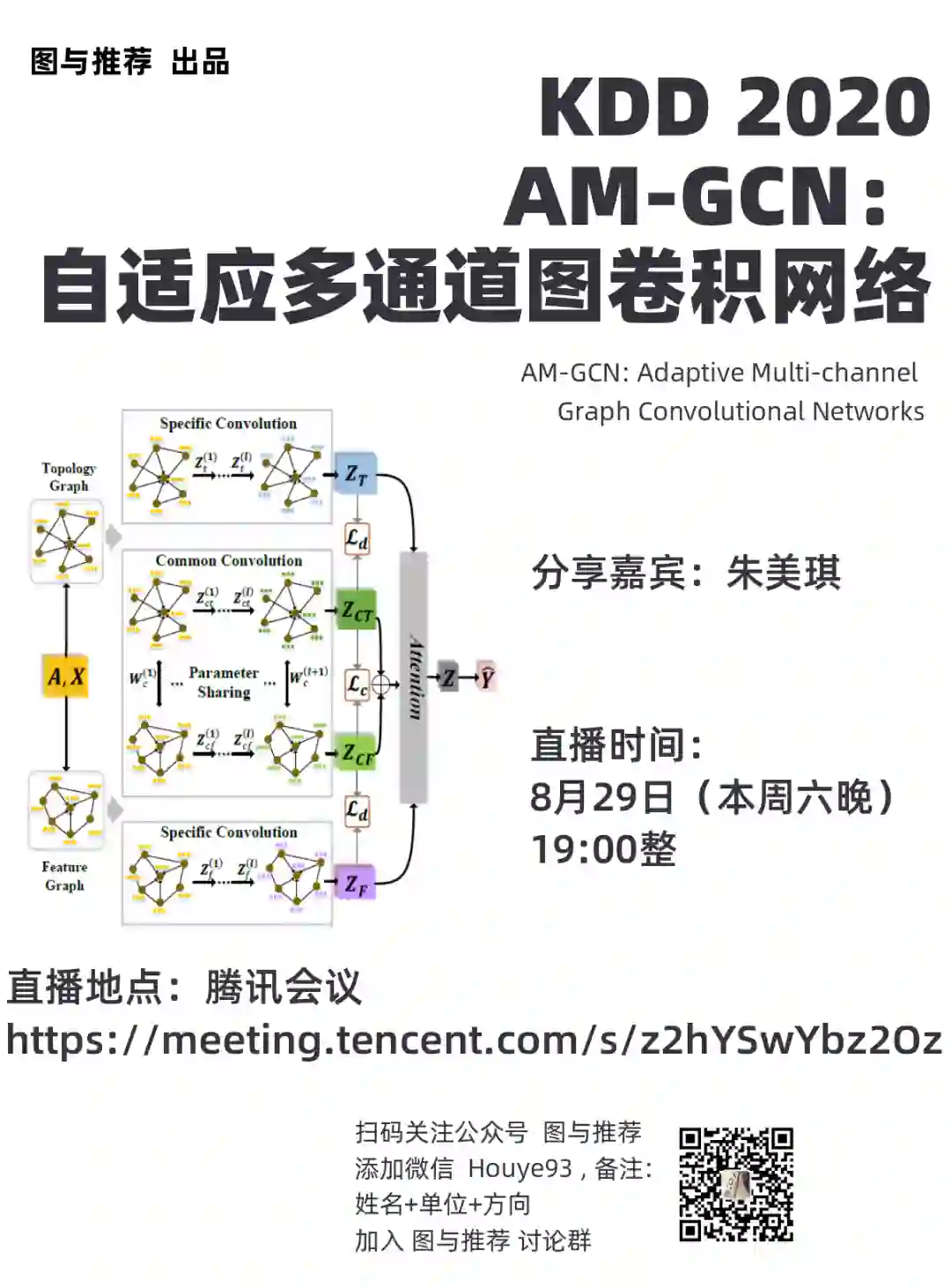 鉴于讨论群中对KDD 2020 的文章《AM-GCN: Adaptive Multi-channel Graph Convolutional Networks》讨论热烈,本公众号邀请了该论文的作者朱美琪来直播为我们分享该论文。