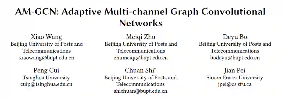 GCN能否在一个具有丰富信息的复杂图中最优地对节点特征和拓扑结构进行融合?此文首先对GCN的融合能力进行了实验探究,并发现GCN融合节点特征和拓扑结构的能力并不理想,融合过程中其自适应能力不高。进而我们提出一种用于半监督节点分类任务的自适应多通路图卷积解决方案(AM-GCN: Adaptive Multi-channel Graph Convolutional Networks)。其核心思想是能够同时从节点特征、拓扑结构及其组合中提取特殊嵌入项和公共嵌入项,并利用注意机制学习嵌入项的自适应融合权重。我们通过真实数据集上的大量实验结果表明,AM-GCN能够自适应地提取出最相关的信息,并提高分类精度与实验效果。