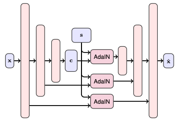 HiDT 的架构是建立在跳跃连接和 AdaIN 结合的基础上,采用 UNet 和 AdaIN 架构起网络的编码和解码器的主体,这个结构如图 2 所示。