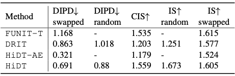 ,在定性对比上,得到的结果如图 5 所示,从左到右对应的是原始图像、FUNIT-T、FUNIT-O、HiDT。