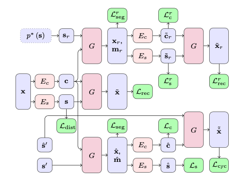 在训练阶段是由目标域图像编码得到,在测试阶段则是通过在先验分布下采样得到,这部分我们待会再详细讨论。