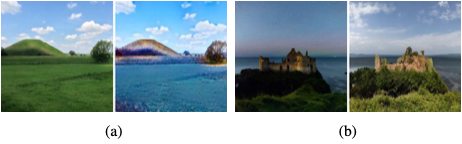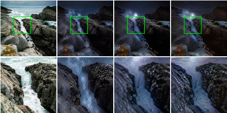 另一方面,引导过滤在水或阳光下能较好地实现转换,但如果通过样式转换更改细小细节,则引导过滤将失败,在高对比度边界附近产生光晕伪影。