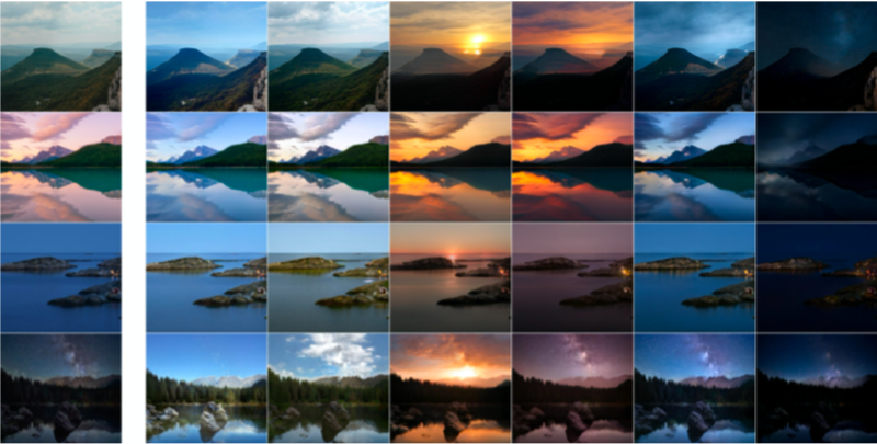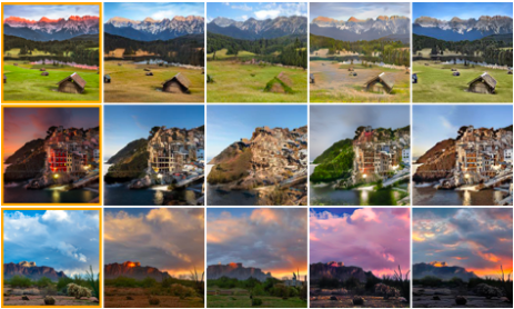 大部分使用 Mac 系统的用户默认动态壁纸是位于洛杉矶卡特琳娜岛的一天场景变化,对应着清晨、日出、正午、傍晚、入夜、凌晨的时移变化,固定机位间隔拍摄可以作为取景,然而这将花费一天时间。如何利用一张高分辨率图像达到时移自然场景的合成,是 HiDT 要实现的任务,文章称之为 Daytime Translation,图 1 展示了任务效果。