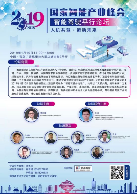 为汇聚智能制造领域的著名学者、顶级专家和业界精英,构建一个开放融合多元的合作交流平台,推动智能驾驶技术创新和产业落地,2019国家智能产业峰会定于2019年1月10日在青岛香格里拉大酒店同期举办“智能驾驶分论坛”。论坛以“人机共驾,策动未来”为主题,以主题报告形式交流探讨智能驾驶发展现状、产业环境、未来趋势,分享智能驾驶领域最新科研成果和应用案例,为智能驾驶领域的科研院所、高等院校、重要机构和知名企业之间合作搭建桥梁,带动智能驾驶产业健康有序快速发展,推动智能出行时代真正到来。