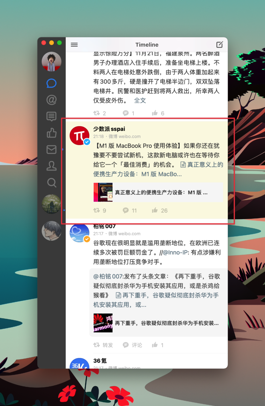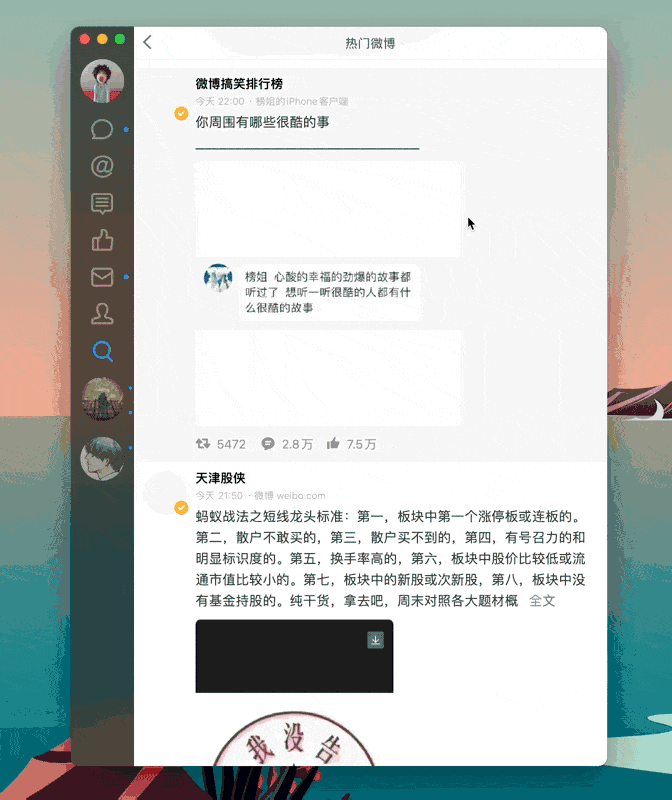 支持 Force Touch 按压操作,可以快速查看微博话题或者外链内容,省去了大量来回跳转甚至调用浏览器的步骤,再次印证在 macOS 里,触摸板还是要比鼠标舒服的多。