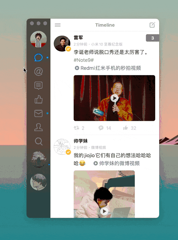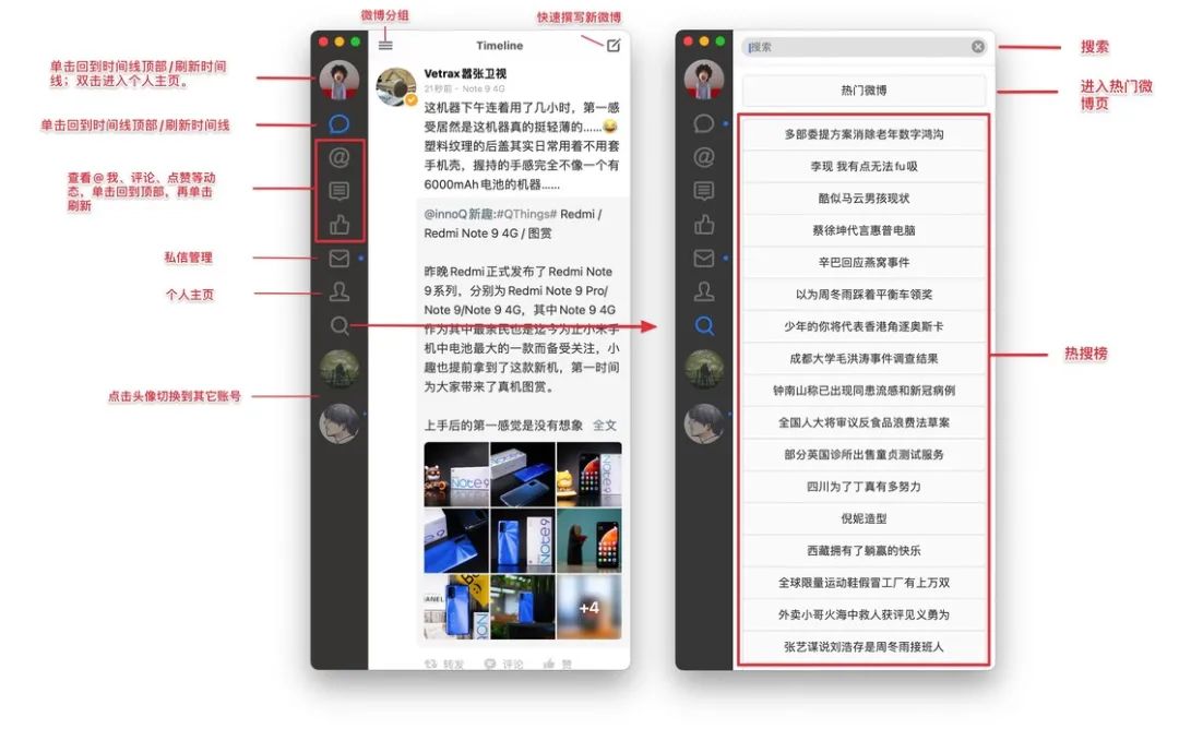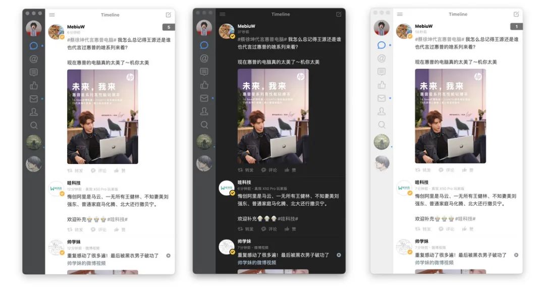 已登录的所有微博账号都会同时出现在侧边栏,直接点击头像就可以切换浏览。对于同时需要管理多个微博账号的用户非常友好。