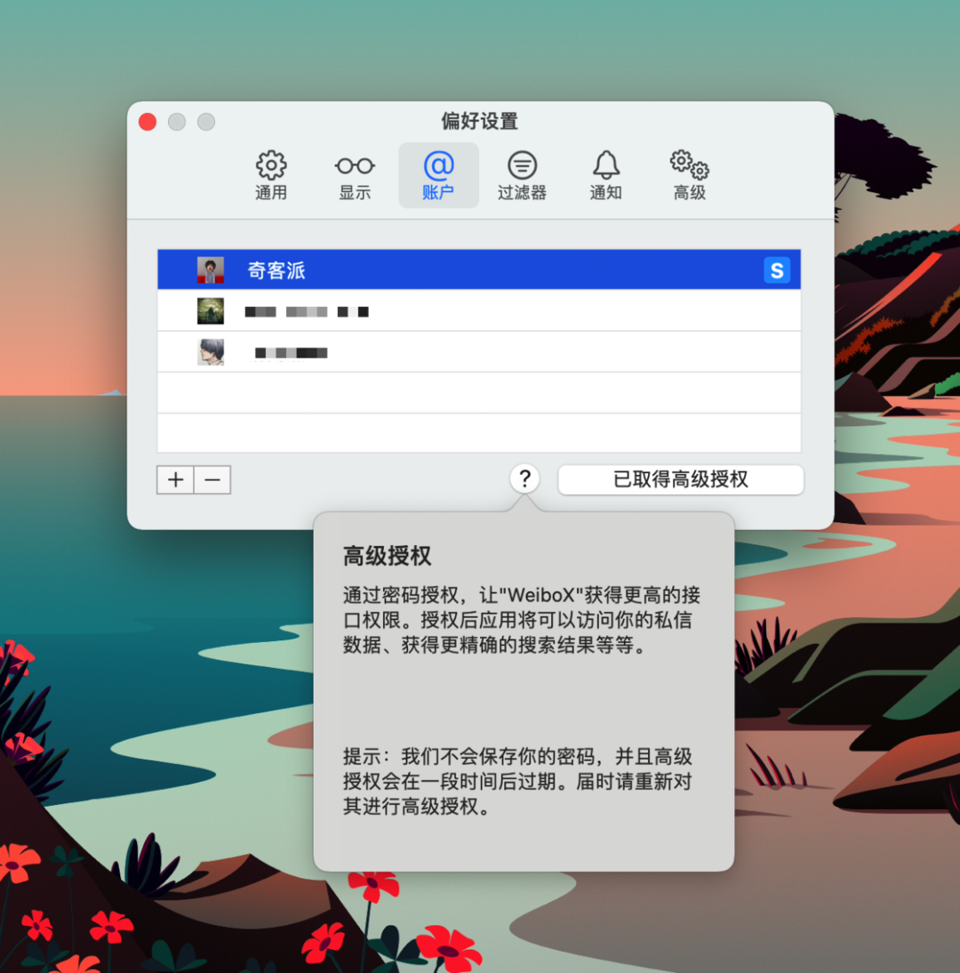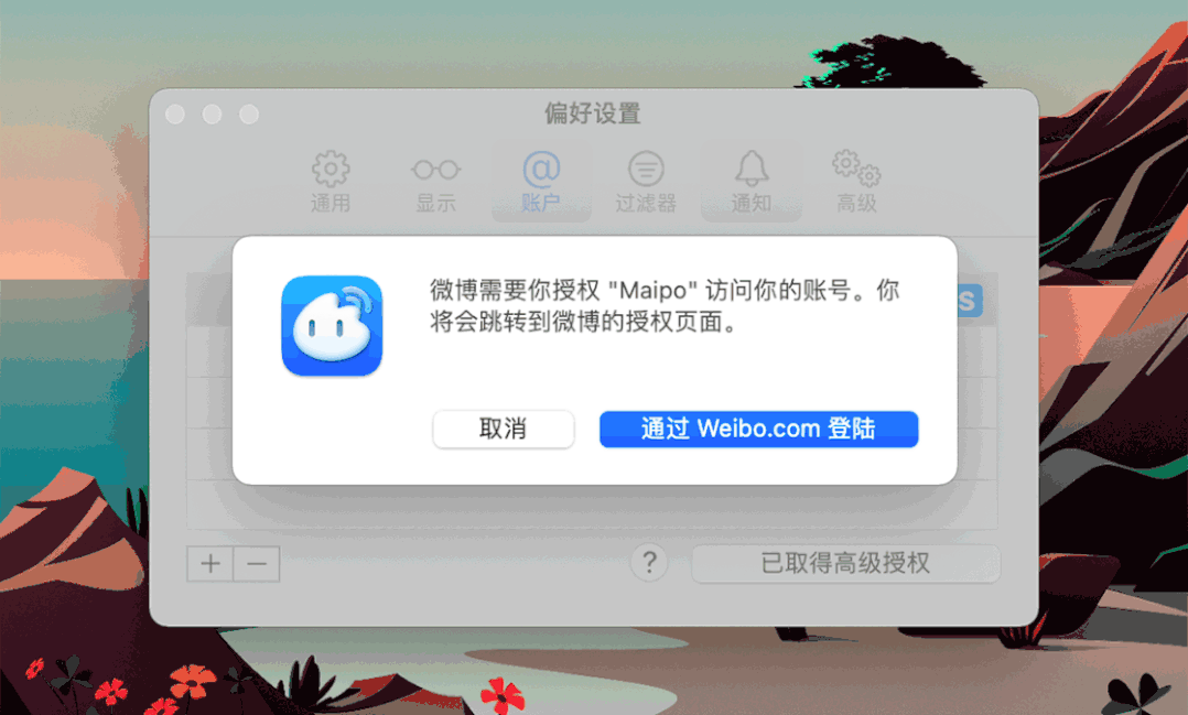 Maipo 登录微博账户默认通过网页端授权登录,之后便可以通过客户端实现浏览及使用一些常用的互动操作,但私信及点赞动态需要进行高级授权,需要手动输入账号密码。软件本身不会保存密码,但真有介意的用户不进行高级授权也能使用大部分功能了。