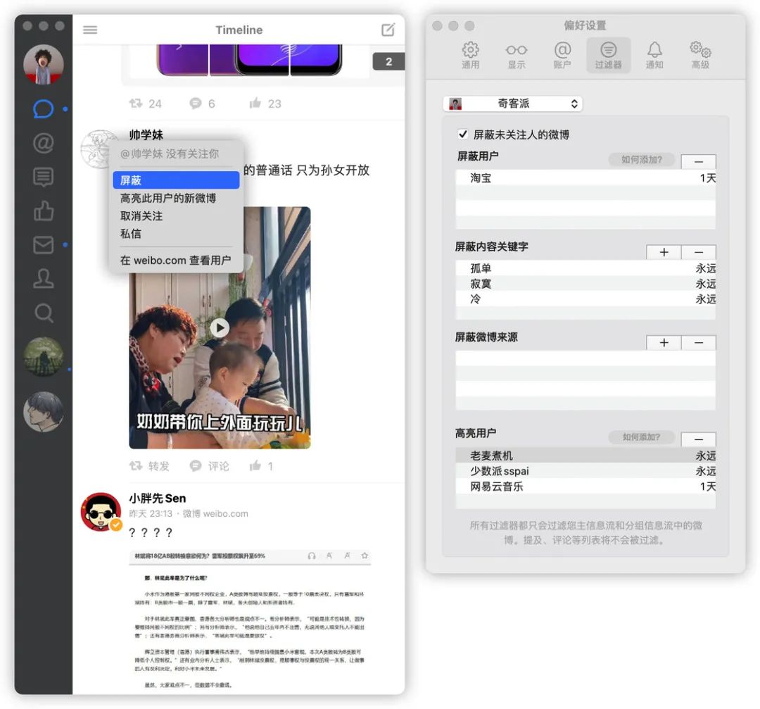 微博上鱼龙混杂,难免会遇到一些自己不想看到的内容,Maipo 支持过滤功能,能够针对指定用户、关键词或者来源设置过滤,自由选择屏蔽一天、一周、一个月甚至永久,这样就能够净化一下信息流了。