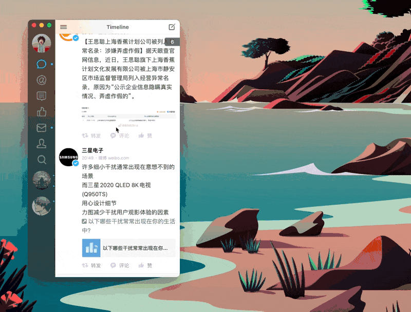 Maipo 已经具备微博网页端的绝大多数功能,并且通过适合 macOS 的交互逻辑来实现,使其更加高效、流畅,日常发布微博、转发、评论都非常方便,充分发挥着独立客户端的便捷性。