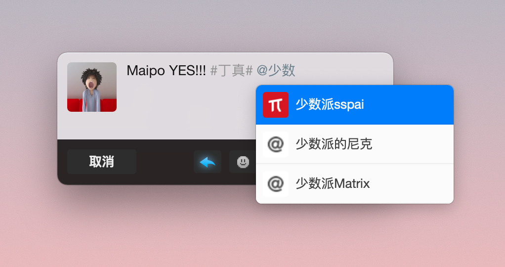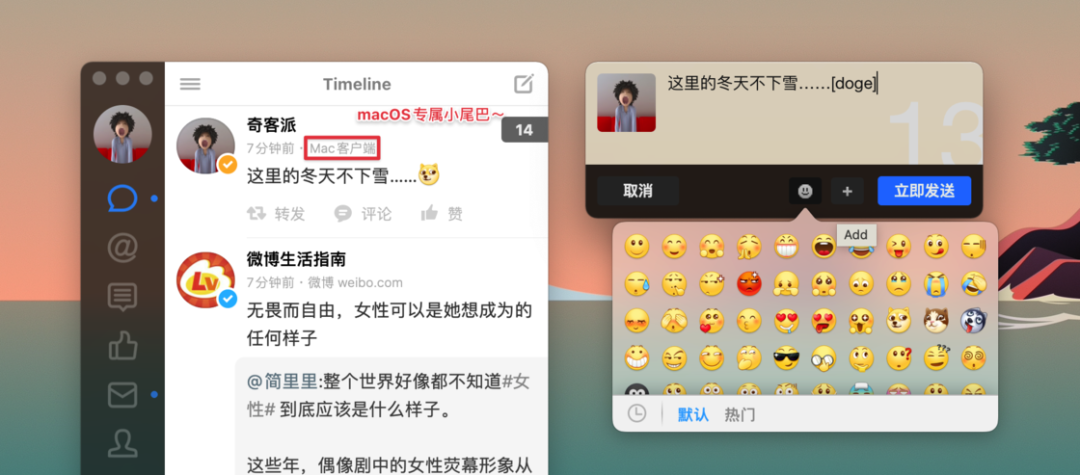 支持添加默认的一些表情,但没有官方客户端丰富,输入文本后会自动显示字数计数,此外「Mac 客户端」小尾巴也算是 Maipo 用户专属了。