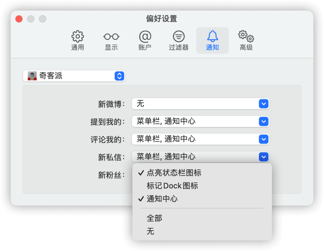 如果有新的动态软件会在图标右下角以小圆点进行显示,以微博动态的更新频率,如果不对通知进行设置,这个小圆点会一直存在。为了减少不必要的打扰,建议在设置中对每个账号的通知进行设置,选择是否需要在状态栏、Dock 或是通知中心展示。