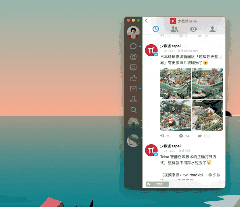 写这篇文章时,我特意再去看了下Maipo官网的技巧提示,才知道打开新的窗口原来可以通过按住「command」加点击跳转实现,也知道 Maipo 支持通过 URL Scheme 来访问部分功能,例如浏览器访问「 weibomac://compose?text=123」 可以打开内容为「123」的发布器,访问「weibomac://user?name=奇客派」可以打开用户的微博主页的等。