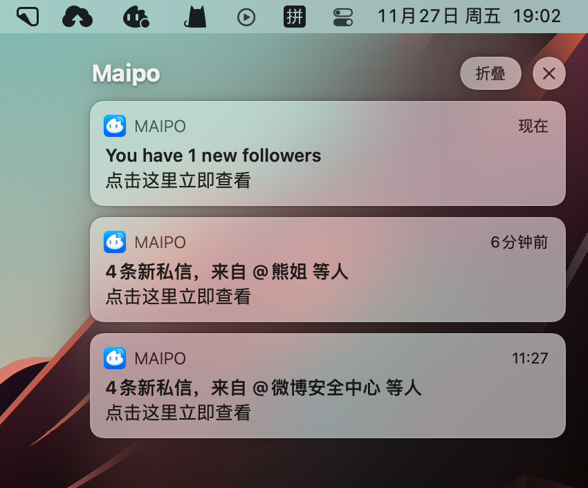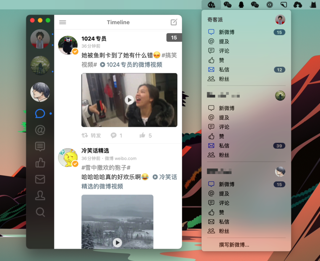 Maipo 默认开启了常驻状态栏图标,点击状态栏图标即可查看当前各个账号的状态,快速选择查看新微博、互动消息或者直接撰写新微博,这也是日常使用微博的主要几个功能,快速直达,这便是独立客户端的优势。