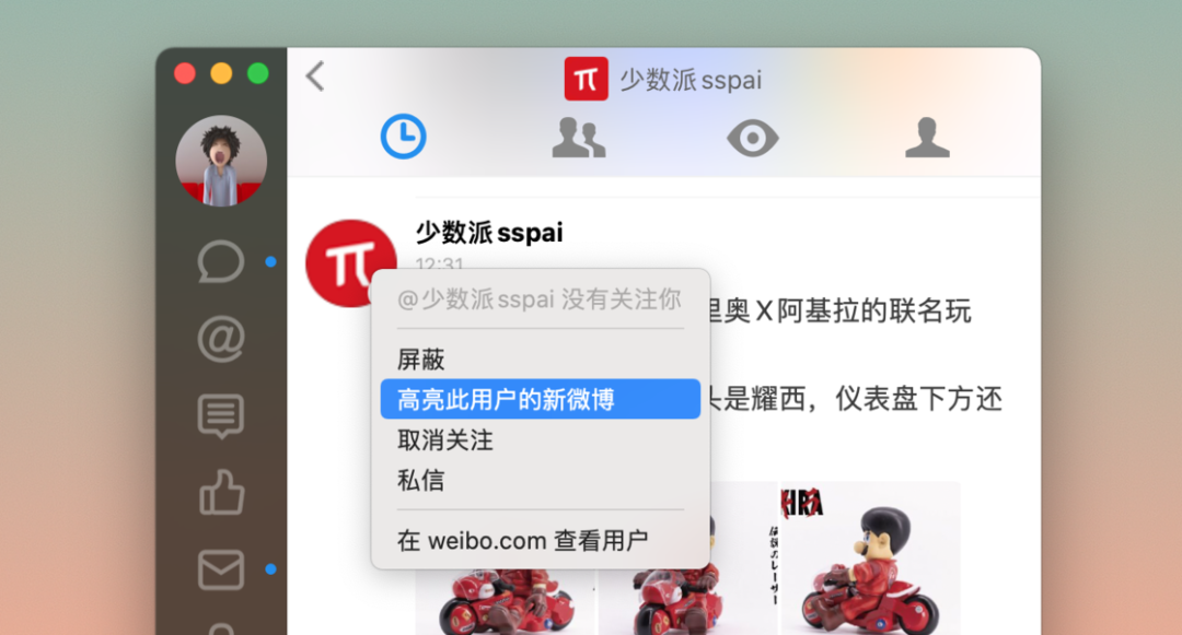 将一些博主设置为高亮,在信息流中将会以浅黄色底色高亮显示,方便在快速浏览时引起注意,这个设置当然只是在 Maipo 中生效。