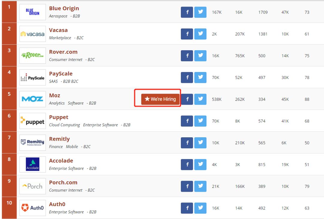 以下是在 Geekwire 上西雅图本地人气最旺的新创公司排名,都是还没有上市的潜力股,Moz 最近正在招人,可以准备投简历啦: