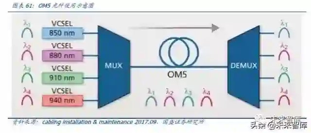 OM5光纤同时支持未来的 400G 以太网,对于更高速的 400G 以太网应用比如 400G Base-SR4.2(4 对光纤 2 个波长,每个通道采用 50G PAM4)或者 400G Base-SR4.4(4 对光纤 4 个波长,每个通道采用 25GNRZ),只需要 8 芯 OM5 光纤。