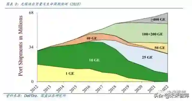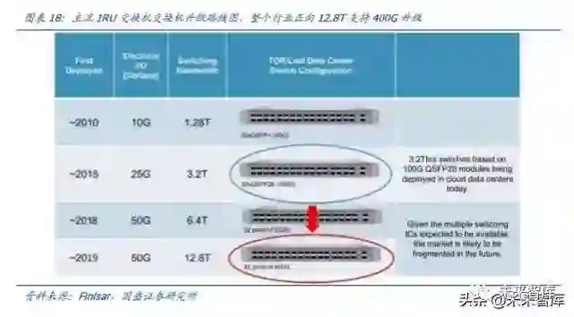 我们参考 Googe 数据中心升级路线,谷歌在 2013 年第五代数据中心谷歌开始启用 40G,2016 年下半年则开始大规模使用 100G,以此类推 2019 年年底有望开启 400G 规模商用。