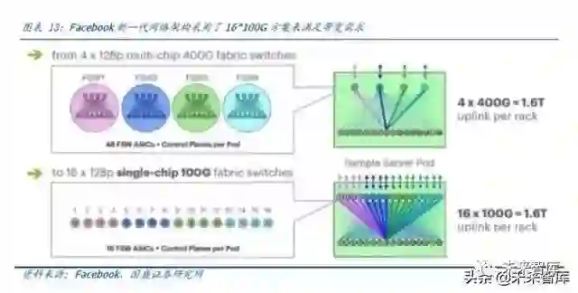 新一代 IDC 网络架构 F16相比上一代 4 fabric 网络架构,在没有使用更高速率光模块前提下,通过提升网络平面数及减少跳数来达到同样带宽的需求,这直接提升了 Facebook 对 100G 光模块需求。