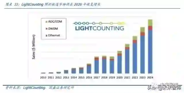 100G光模块的市场在首款32X100G交换芯片(博通 Tomahawk)开始送样是在2014年,2016 年 100G 的光模块开始规模上量。