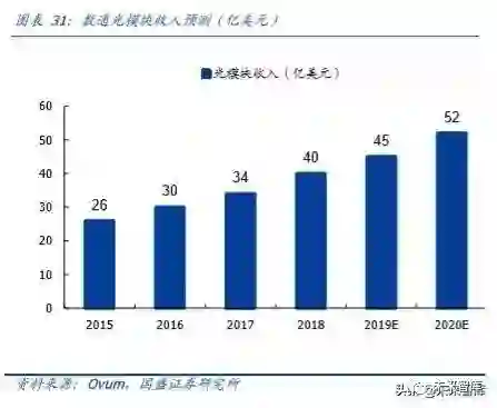 海外数据中心光模块专业咨询机构 LightCounting于 2019 年 4 月发布光通信市场预测报告,其中上调了对于以太网段光模块销售收入预测,主要原因是 100G 光模块的销量在增长,同时认为 Facebook F16 数据中心新网络架构对于相同数量的服务器,它需要 3-4 倍的 100G 光学器件,整个数据中心端口数量较之前有数倍增长,那么当 Facebook 开展 400G 升级进程后,对 400G 光模块需求量将会是巨大的。