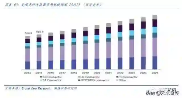 根据 Grand View Research 预测,美国光纤接器市场因为对互联网数据中心建设和通信基础设施建设的投入不断增大,接下来几年将呈现持续稳定上升的趋势。