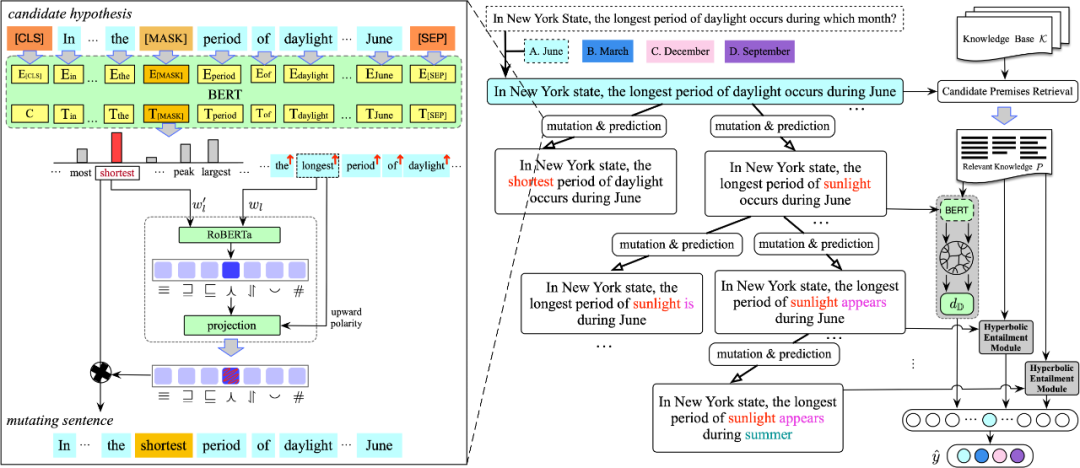 图2描述了NeuNLI的整体架构。给定一个问题“In New York State, the longest period of daylight occurs during which month”以及候选答案,NeuNLI将问题和每个候选答案(例如“June”)转换为陈述句