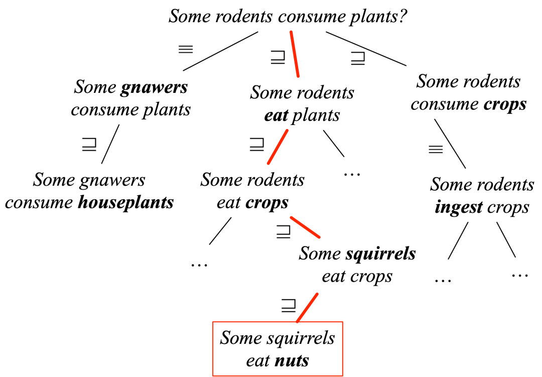 图1 自然逻辑证明过程,该过程从一个假设“some rodents consume plants”开始,推理找到了一个前提“some squirrels eat nuts”,边上的标签展示了相连的两个句子之间的逻辑关系