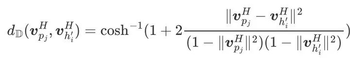 由于被替换词“longest”的极性是单调向上的,并且模型预测“longest”和“shortest”之间的逻辑关系是 ,所以替换前的 和替换后的 ,他们之间的语义关系仍然是 ,如果分析器给出“longest”的极性是单调向下的,那么句子级关系将会是 。由于模型只对 或 这两种句子级的关系进行推理,所以,用“shortest”进行替换的路径将被剪枝掉。给定一个中间假设 ,模型需要计算中间假设 和每个候选前提 之间的蕴含分数 。中间假设和候选前提在欧式空间中的向量表示利用BERT预训练模型计算,其输入形式为[CLS] [SEP] [SEP]。标记[CLS]和居中的标记[SEP]的向量表示分别作为候选前提和中间假设的向量表示,符号记作 和 。对于推理过程形成的树状分层结构,产生的中间假设的数量呈指数级增长。然而,欧氏空间是以多项式的速度增长,这将导致在欧氏空间中学习树状结构的表示会产生结构失真。此外,自然语言文本本身也具有层次结构。因此,模型在双曲空间中计算它们之间的蕴含分数,如图2的右侧部分所示。模型利用Poincare球模型,将候选前提和中间假设投射到双曲空间,以获得更精确的表示 和 。双曲空间中的蕴含分数是根据双曲距离计算得到,双曲距离的计算公式如下: