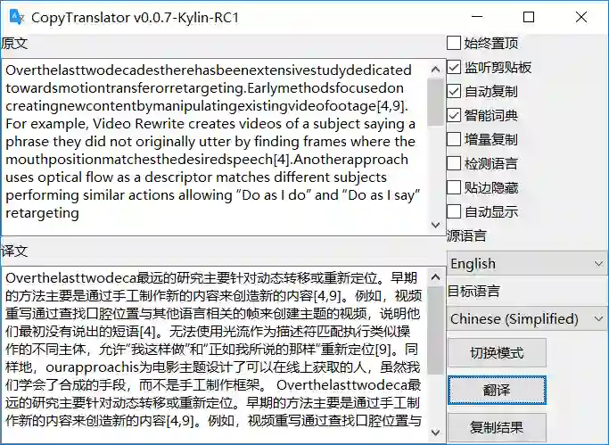 核心用法:打开网页或 PDF,Ctrl+C 复制要要翻译的本文,CopyTranslator 监听到剪贴板变化,会将剪贴板内容进行处理(如去除多余换行等),自动翻译,不用粘粘,并立刻给出结果。