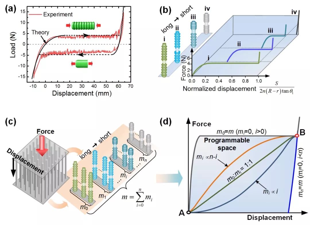 图2. 三维像素超材料的力学行为:(a) 多稳态机械像素的力-位移曲线:具有滞回环;(b) 通过改变机械像素初始长度调节力-位移曲线;(c) 通过设计机械像素阵列的高度分布实现整体力学性能编程;(d) 超材料力-位移曲线的编程空间