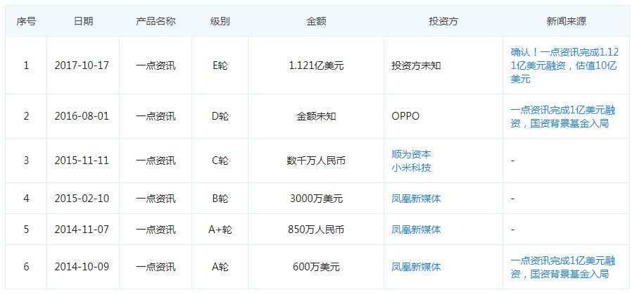 据企查查显示,一点资讯目前已完成E轮融资,其中前三轮投资方均为凤凰新媒体。彼时,凤凰网总裁李亚正担任一点资讯CEO。2017年9月8日,李亚辞去在凤凰网的行政职务,投入到一点资讯业务的战略发展中。但在2019年1月,一点资讯发内部邮件宣布原CEO李亚被免除职务,改由创始人任旭阳接任CEO。