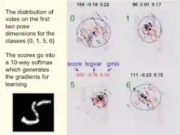 得到高分的簇的分类所对应的上层capsule会接受下层capsule提供的generalized pose,相当于做了routing。这是因为下层的这些输出,“选择”了上层的capsule,“找到最好的(处理)路径等价于(正确)处理了图像”,Hinton这样解释。Hinton称这种机制为 “routing by agreement”。