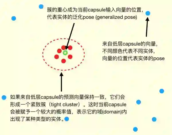 然后通过对底层的Capsule做coincidence filtering(巧合筛分)决定激活哪些高层的Capsule。coincidence filtering是一种通过对高维度向量进行聚类来判断置信的方式,Hinton举了一个例子: